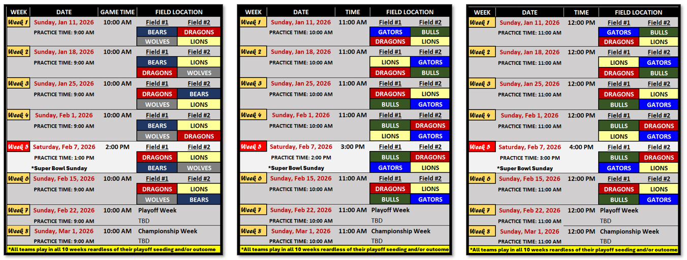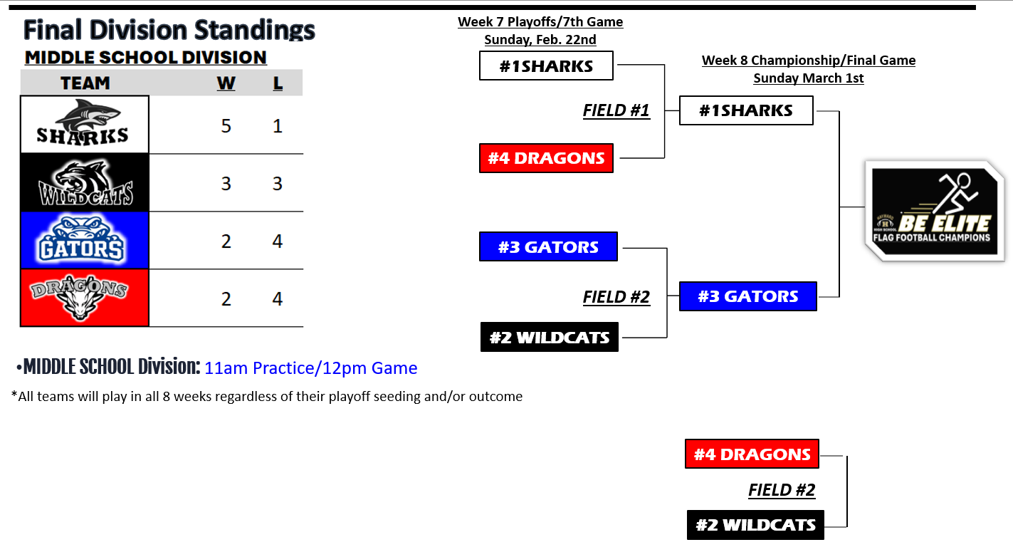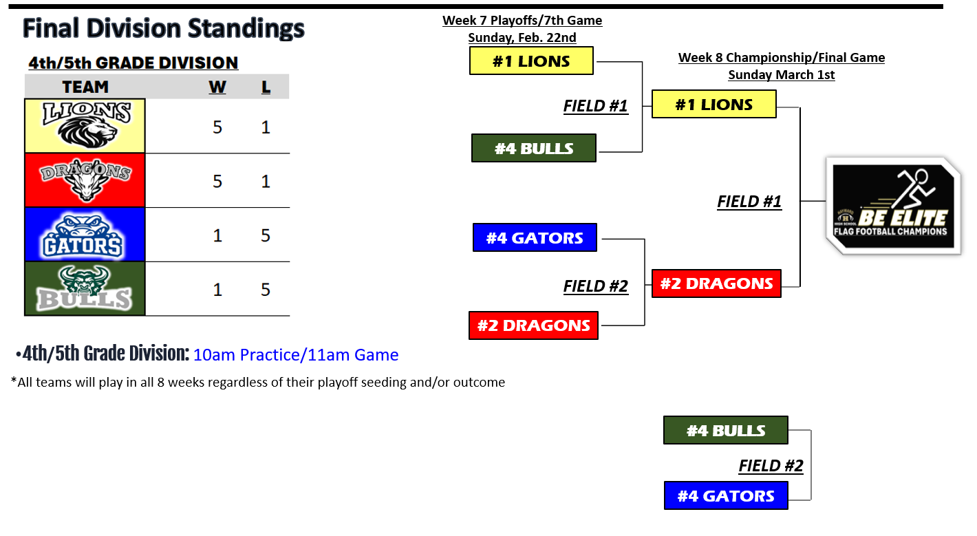 2026 BE ELITE FLAG FOOTBALL HAYWARD HIGH SCHOOL 2nd/3rd Grade Division DIVISION STANDINGS/PLAYOFF BRACKETS